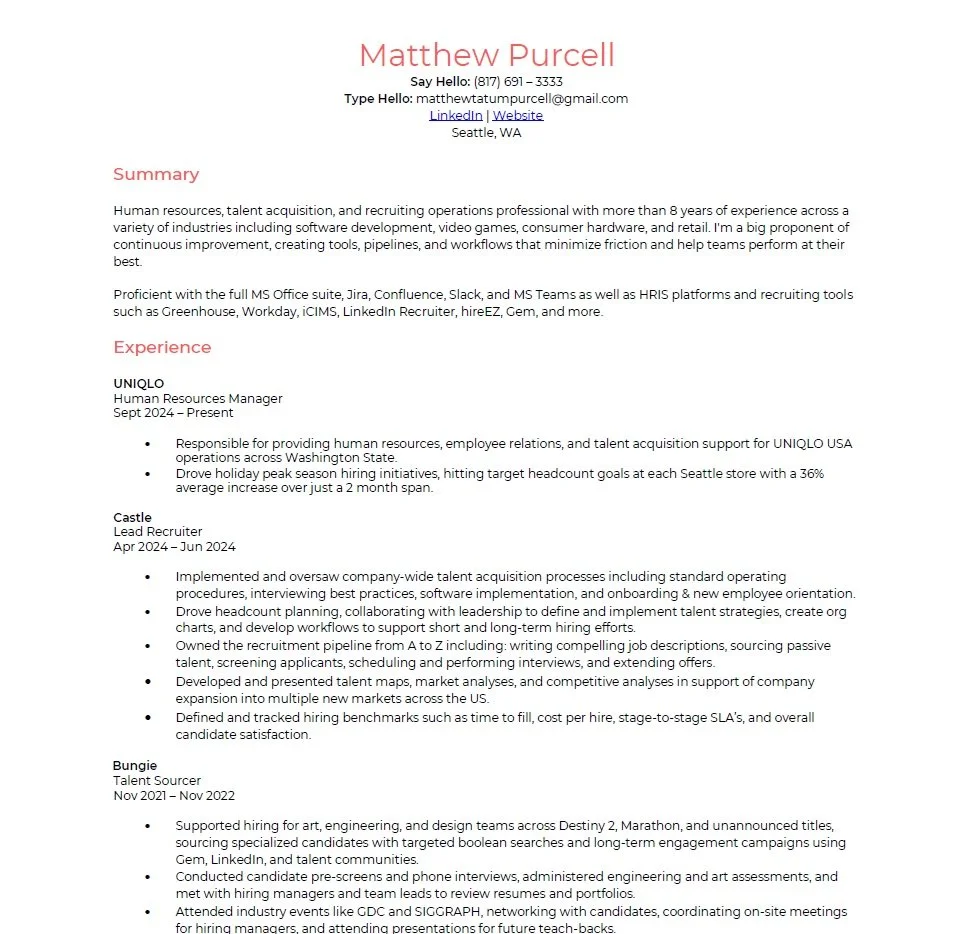 Dig into my background and learn more about the companies, industries, and roles I’ve hired for. To view a full copy of my resume, click the button below or anywhere on the resume itself. Feel free to check out my LinkedIn profile as well and send me a connection request - I’d love to network with you!